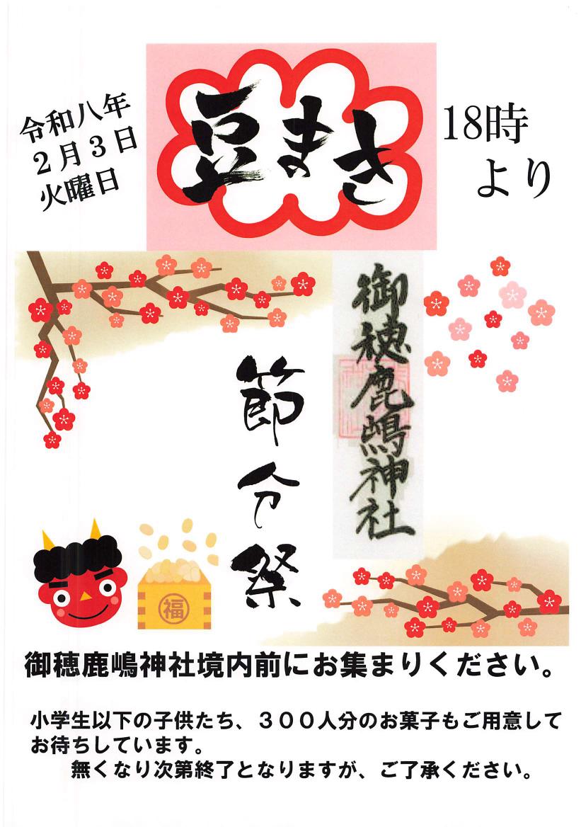 2月3日は恒例の節分祭です。御穂鹿嶋神社にて豆撒きを行います。